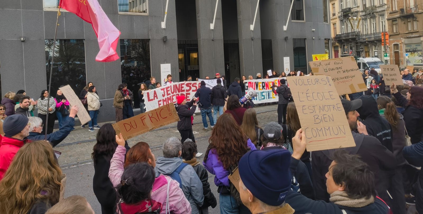 In Sint-Gillis kwamen 150 scholieren en onderwijspersoneelsleden samen op het Moricharplein om van daaruit, en passant langs de MR, naar de samenkomst van CGSP-Enseignement voor het ministerie te trekken.